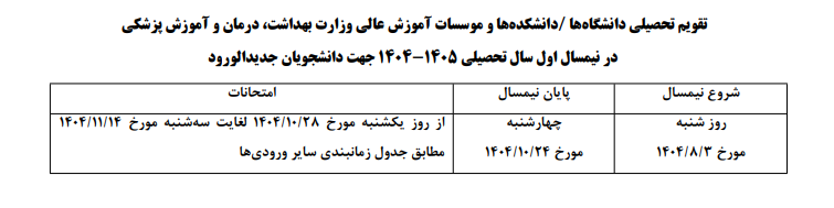 تقویم تحصیلی نیمسال اول سال تحصیلی 1405-1404 دانشجویان جدیدالورود