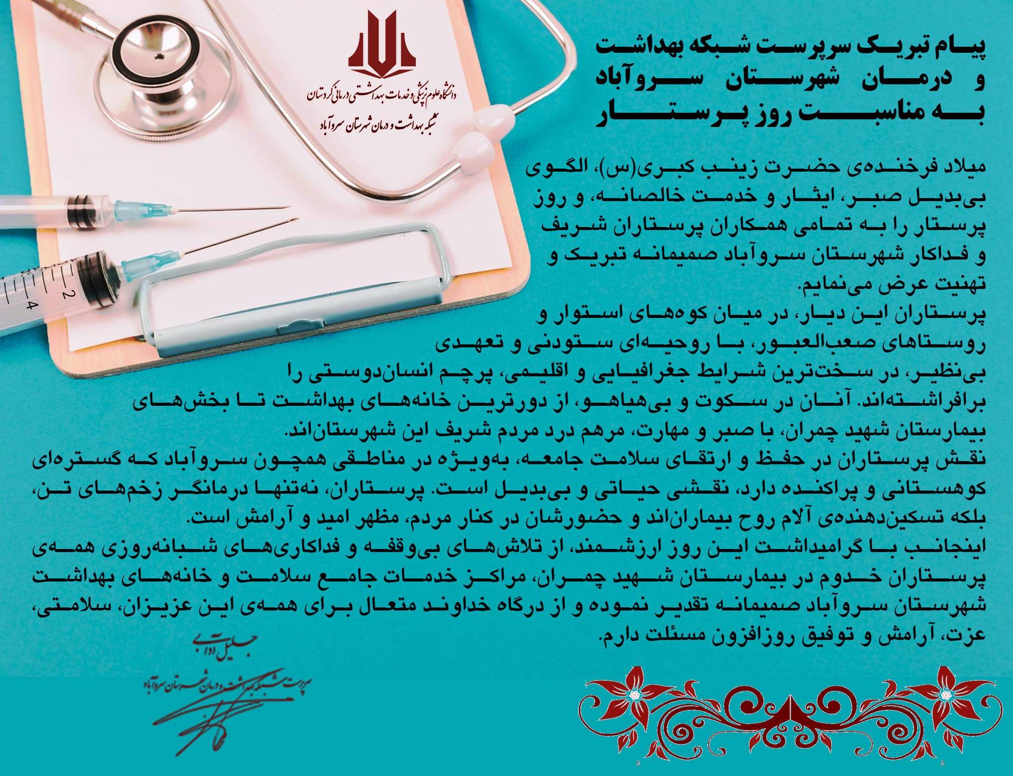 پیام تبریک جلیل آدابی مدیر شبکه بهداشت و درمان شهرستان سروآباد به مناسبت روز پرستار