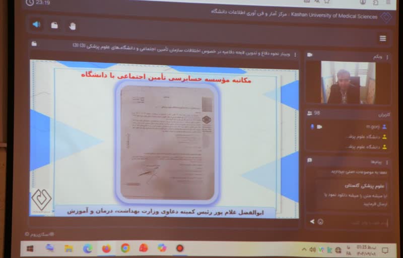 سخنران این وبینار آقای ابوالفضل غلامپور رئیس کمیته دعاوی وزارت بهداشت، درمان و آموزش پزشکی بود که با حضور معاون توسعه مدیریت و منابع دانشگاه، مدیر امور حقوقی و کارشناسان حوزههای حقوقی و مالی دانشگاه برگزار شد، مباحثی همچون محاسبات و بررسی سوابق بیمهای کارکنان، مطابقت حق بیمهها با مفاد قراردادها و نحوه تهیه مستندات دفاعیه در پروندههای مرتبط با سازمان تأمین اجتماعی مورد بحث و بررسی قرار گرفت.