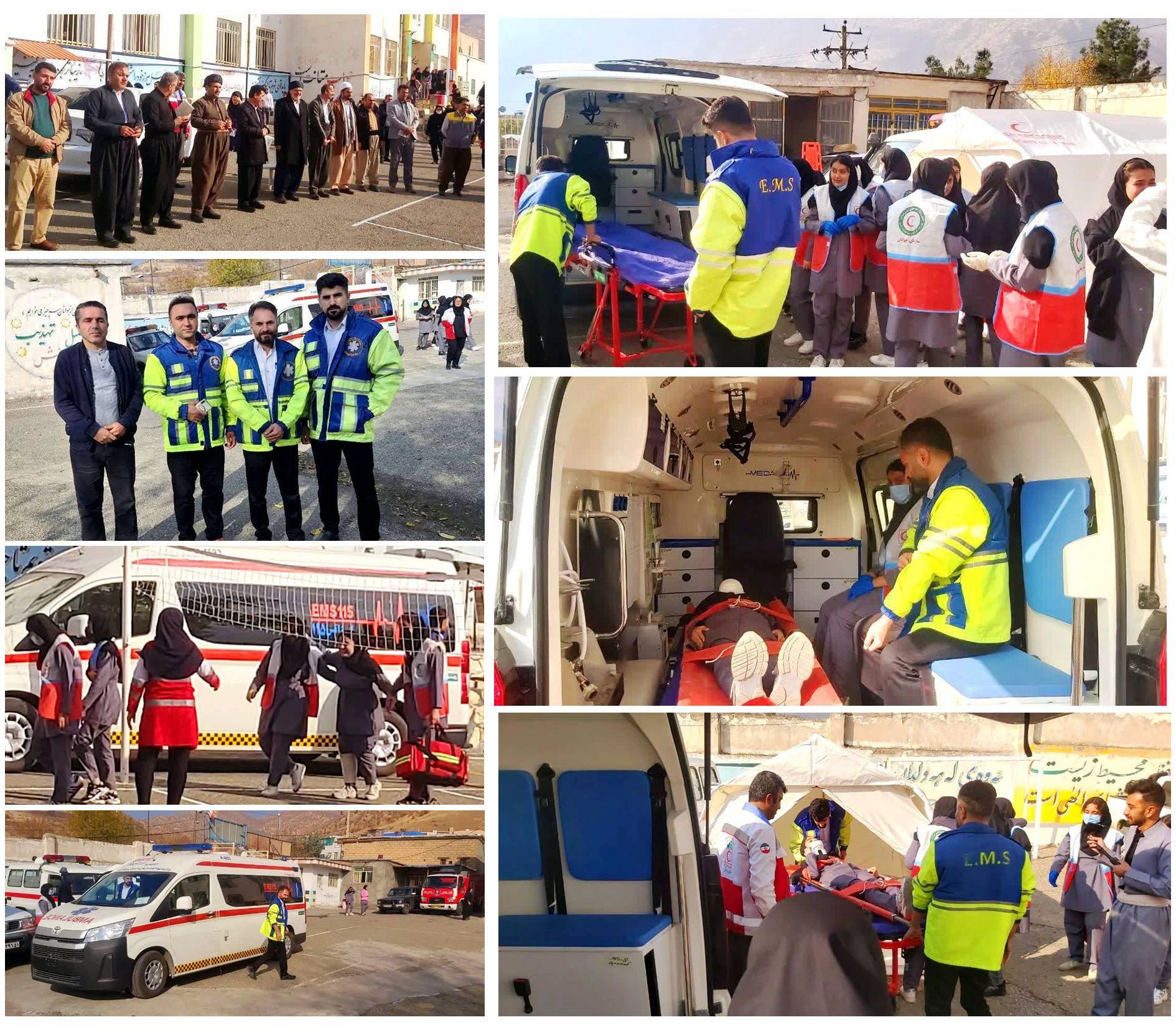به گزارش روابط عمومی شبکه بهداشت و درمان شهرستان سروآباد، این مانور شامل بخشهای مختلفی از جمله اجرای عملیات امداد و نجات توسط تیم جمعیت هلالاحمر، آموزش اصول اطفای حریق و نحوه قطع اضطراری گاز و برق توسط ادارات مربوطه بود. تیم اورژانس پیش بیمارستانی ۱۱۵ نیز با هدف ارائه خدمات فوری به مصدومان احتمالی در محل حضور داشت.