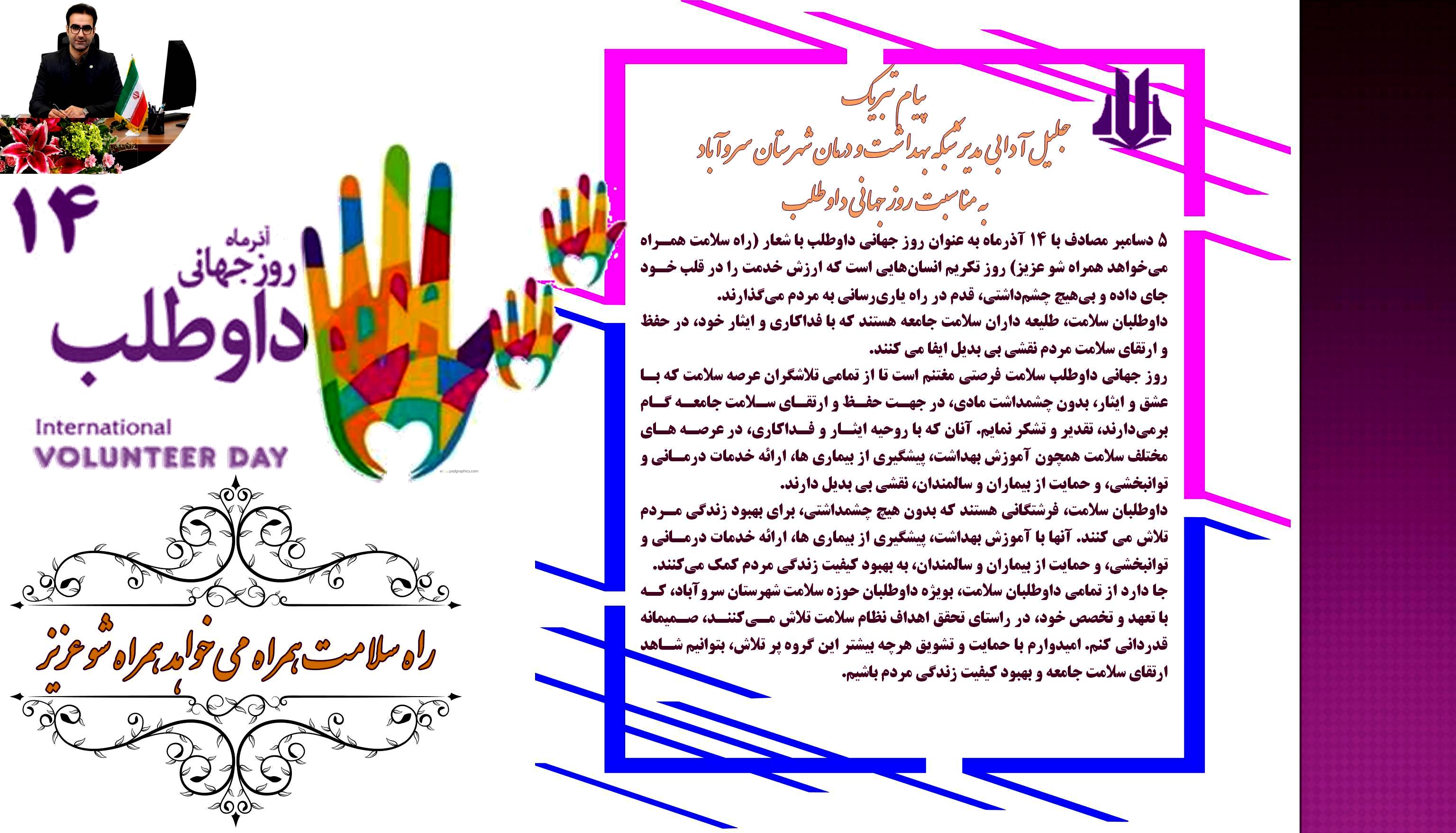 5 دسامبر مصادف با 14 آذرماه به عنوان روز جهانی داوطلب با شعار (راه سلامت همراه میخواهد همراه شو عزیز) روز تکریم انسانهایی است که ارزش خدمت را در قلب خود جای داده و بیهیچ چشمداشتی، قدم در راه یاریرسانی به مردم میگذارند.