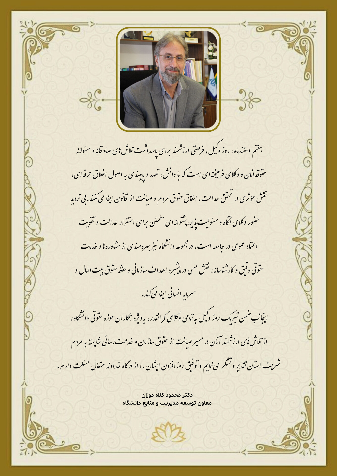 دکتر محمود کلاهدوزان، معاون توسعه مدیریت و منابع دانشگاه، در پیامی فرا رسیدن روز وکیل را تبریک گفت.در متن این پیام آمده است: